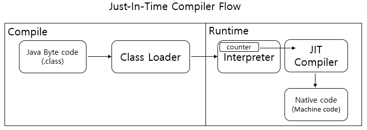 - 인터프리터 내부의 Counter가 만족되면 JIT 컴파일러를 호출하여 실행하게 된다. (중복되는 코드는 캐싱된 코드를 사용한다.)
