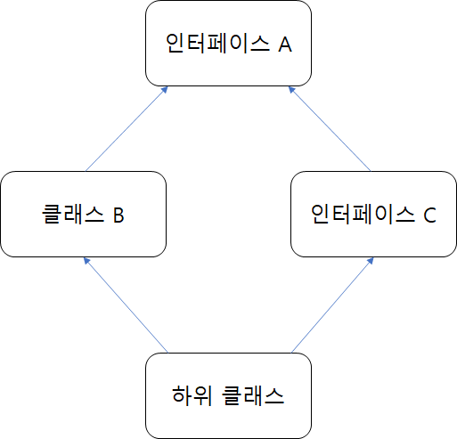 이러한 구조를 가지고 있을 경우에 인터페이스 간의 동일한 이름의 메서드가 존재한다면, 어떤 메서드를 사용할지 모르게 되므로 컴파일 에러가 발생하게 된다.