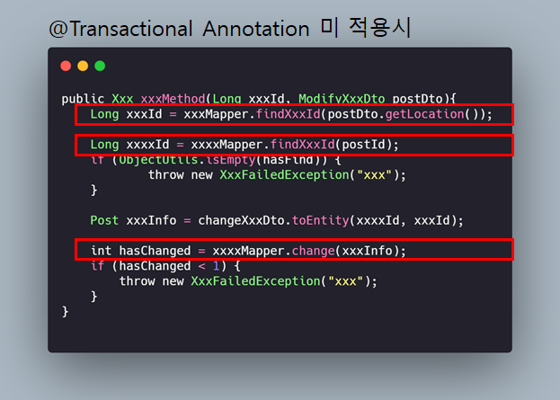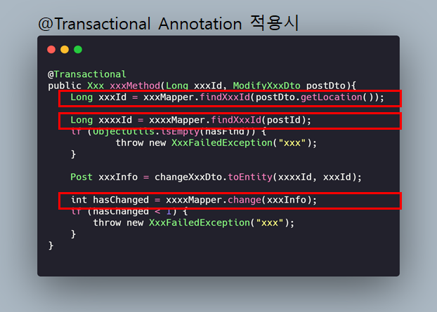 해당 메서드 내에서는 3개의 트랜잭션이 동작하며, 이는 내부에서 하나의 DAO 로직이 실패하더라도 다른 로직들은 성공하고 반영될 수 있는 상태임을 의미한다.