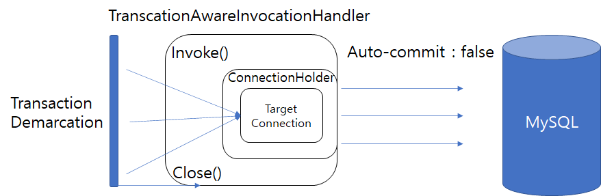 - DAO의 호출을 위한 connection을 트랜잭션 경계 상단에서 생성한다.
