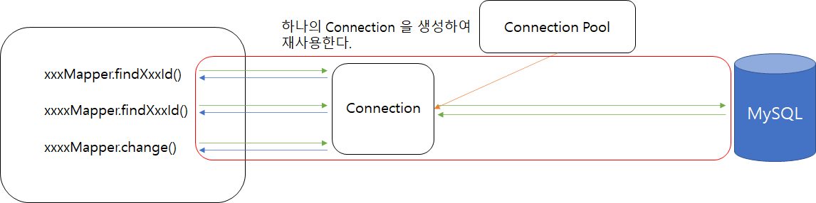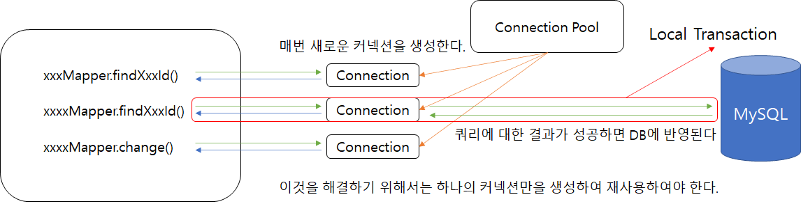 각각의 로직들은 Connection Pool에서 리소스 전달받아 새로운 Connection을 생성하며, Auto-Commit을 진행한다.