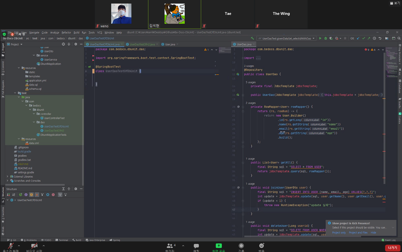 금주 목요일에는 저에게 생소했던 라이브러리인 DbUnit에 대해 학습하고, 정리된 내용과 예제 프로젝트를 이용해 발표하는 시간을 가지게 되었습니다.