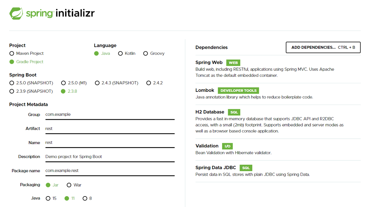 기호에 맞게 Maven, Gradle, Java 버전 등을 선택하시면 됩니다.