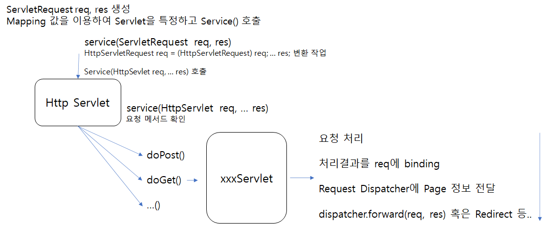 - → 해당 메서드에서는 Servlet 응답, 요청 객체를 HttpServlet 응답, 요청으로 Casting 한다.