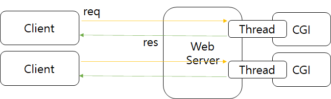 - 매 요청이 들어올 때마다 프로세스가 생성되고 각각의 CGI 구현체를 통해 동작한다.