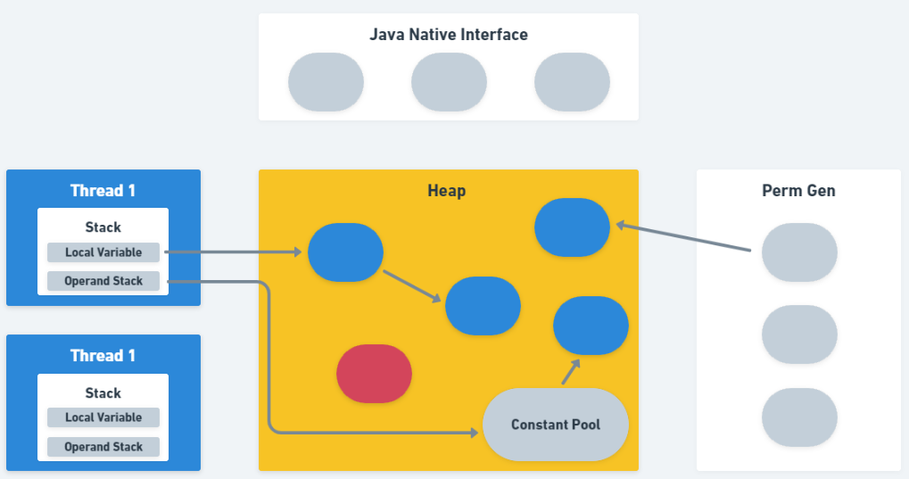 - 각각의 쓰레드의 Stack 영역에 존재하는 Local Variable, Operand Stack에 존재하는 참조 값 등