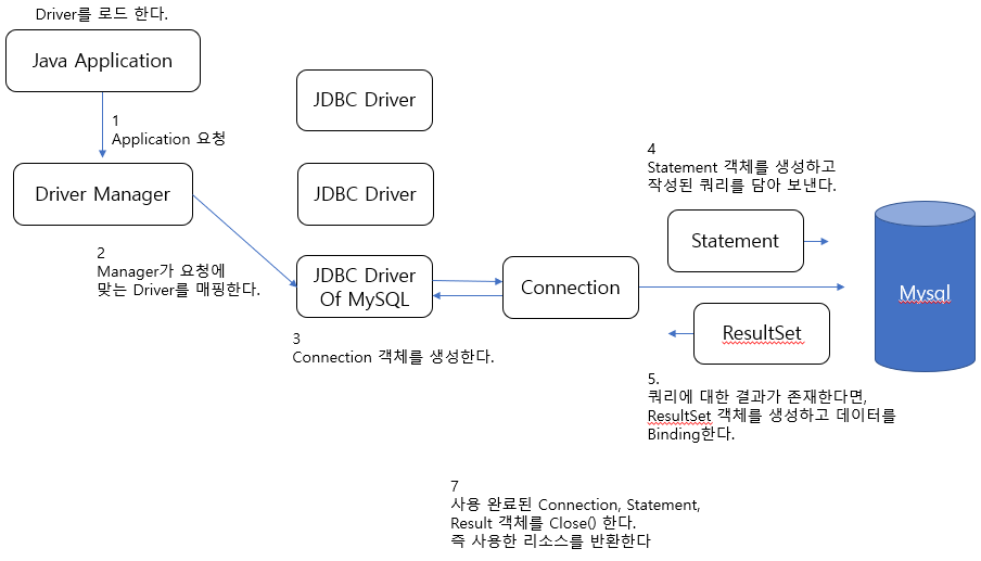 접근 API 모듈 즉, Driver Manager는 getConnection() 이란 정적 팩터리 메서드를 가지고 있는데, 프로젝트에서 정의한 데이터 소스, 의존성을 통해 MySQL에서 제공하는 JDBC Driver가 추가되고 해당 구현체가 구현한 커넥션을 반환받을 수 있습니다.