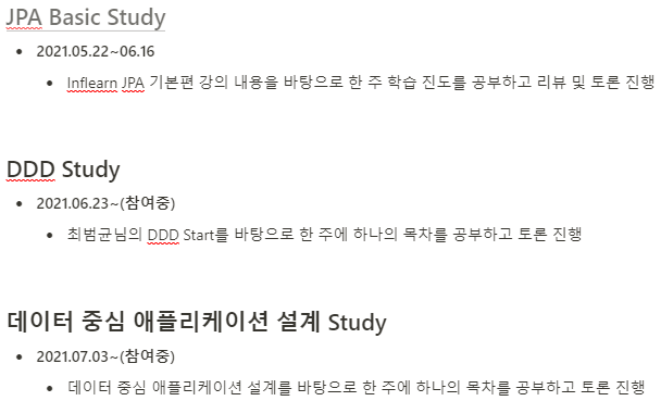 - 여유만 있다면 스터디 주제를 정해 정리하고 발표 일정을 잡은 뒤 회의실을 빌려 주제에 대한 리뷰 등을 진행할 수 있었다.
