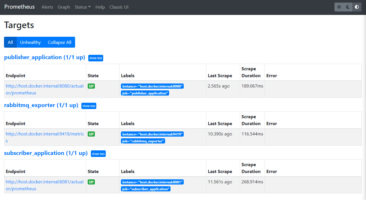 상단 메뉴바의 Status를 클릭하여 Targets 목록을 선택하면 yml에서 구성한 정보를 기준으로 구성된 Target Application 목록을 볼 수 있습니다.