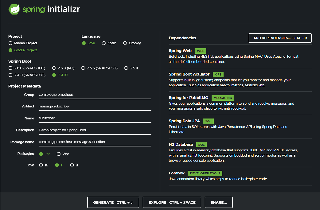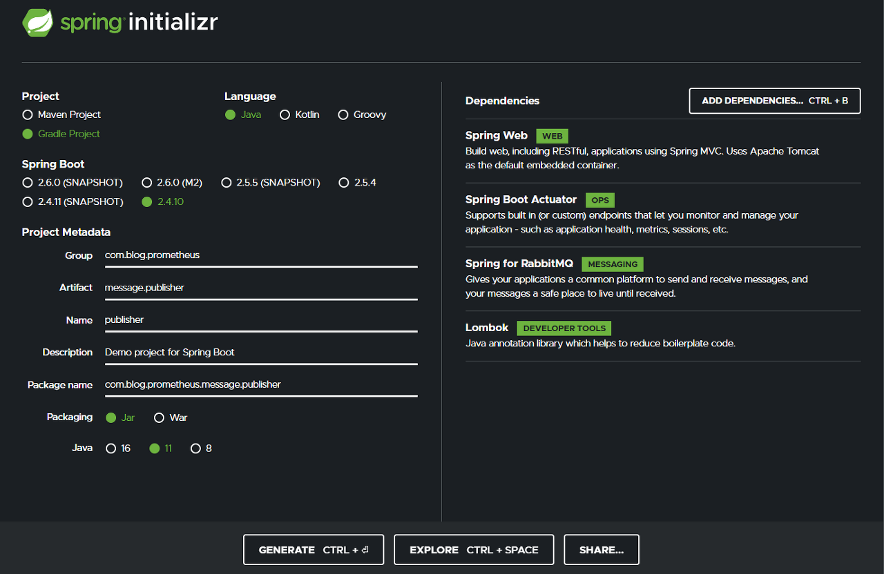 우선은 RabbitMQ 메세지를 생산할 Publisher Application을 구현해보겠습니다.