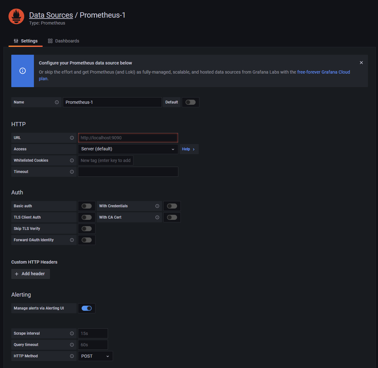 - Time series databases 항목에서 Prometheus를 선택합니다.