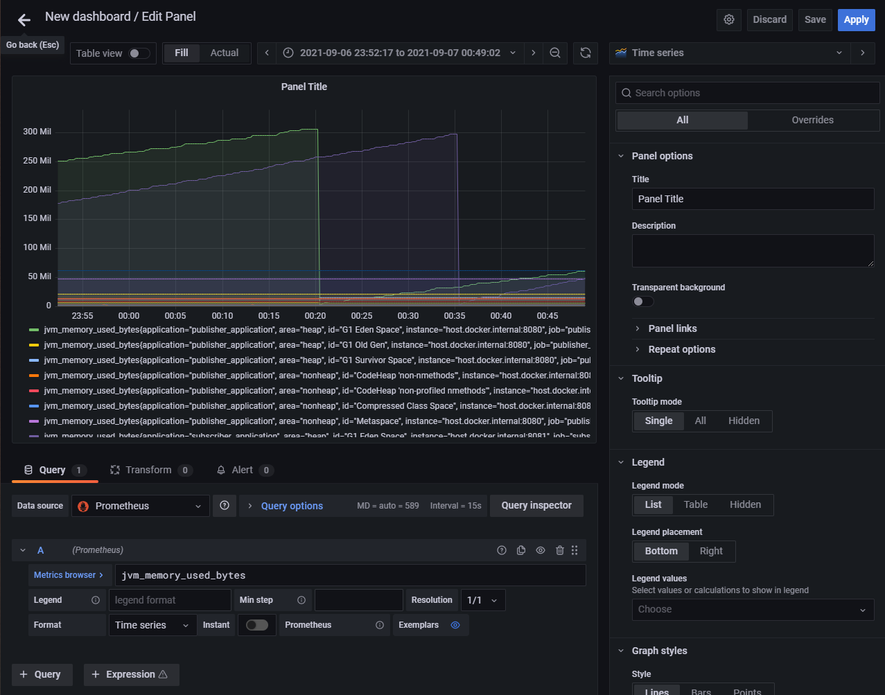 이제 현재 JVM 메모리 사용량을 나타내는 jvm_memory_used_bytes metric를 이용해 Time series를 만듭니다. 별도 설정이 없다면 위에서 만든 pub/sub application 정보가 모두 등록됩니다.