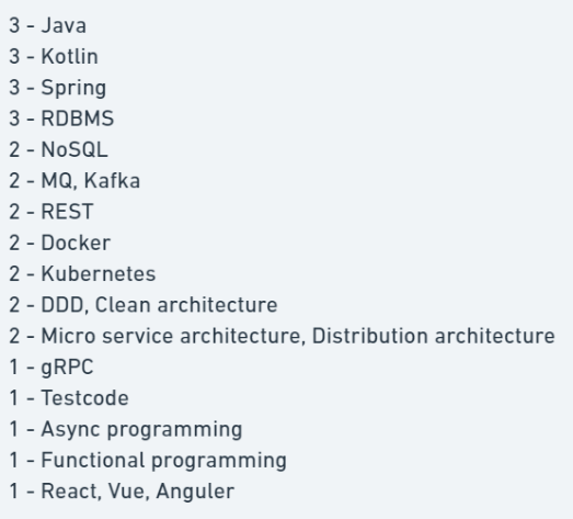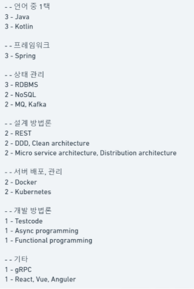 - 뽑은 기술 스택을 유사 항목 별로 그룹으로 나누고 중복된 수를 적기