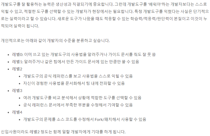 - 개발 생태계에서 공부를 끝낸다 라는 전제는 존재하지 않기 때문에 지속적인 학습이라는 것에 더 중점을 두어야 합니다.
