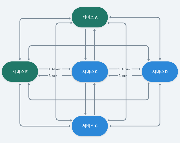 그렇기에 각 서비스는 모든 서비스 존재를 알고 있지 않도록 범위를 나누어 메시지 요청으로 인한 장애 감지의 신뢰성과 떨어진 효율성을 어느 정도 보완하게 됩니다.