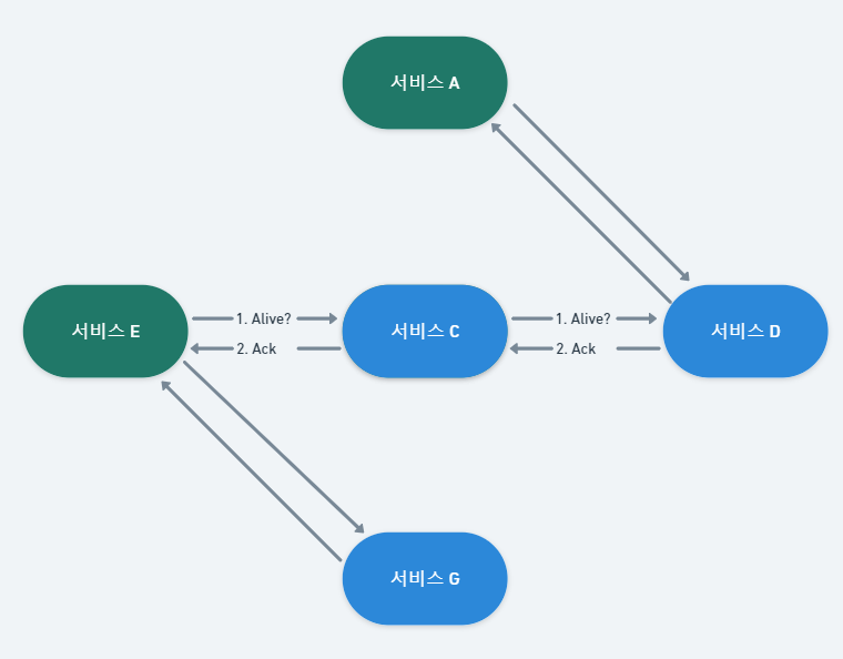 - 물론 모든 장애가 서비스 종료, 충돌과 같은 완전 중단 상태를 의미하는 것은 아니며, 상황에 따라 부하로 인한 응답 지연, 네트워크 지연 이슈 혹은 데드락으로 인한 것일 수 있습니다.(이런 상태는 시간이 지나면 해결되는 문제이기 때문입니다.) 그렇기에 좀 더 정확한 감지 방식이 필요합니다.