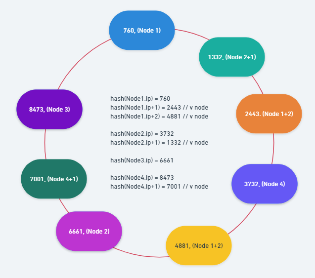 해당 문제를 방지하기 위해서, (그리고 Rebalancing 단위를 좀 더 최소화 하기 위해서) 기존 Shard Node의 ip에 특정 값을 추가하여 Hash 한 후 이를 Virtual Shard Node로 추가하여 Shard Node마다 관리하는 Shard Key, Data의 수를 조절할 수도 있습니다.