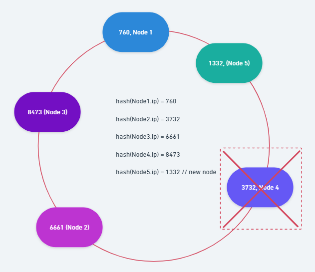 새로운 노드가 추가되었을 때에는 앞선 상황과 마찬가지로 해당 Shard Node의 IP를 Hash하여 Index를 지정하고, 나온 Index 값보다 낮은 값을 가진 인접 Shard Node와 자신 사이에 속하는 Data만 Rebalancing을 진행합니다.
